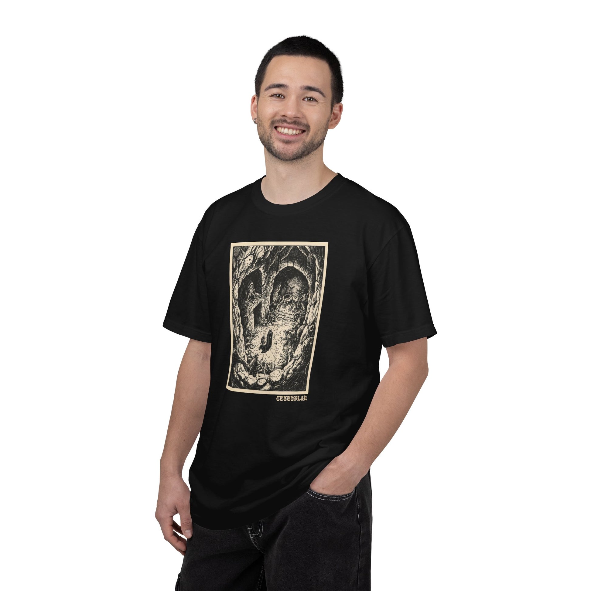 This garment-dyed tee brings a quiet, brooding mood to your everyday wardrobe. The heavyweight 100% ring-spun cotton feels substantial and broken-in from the first wear thanks to post-construction dyeing and a soft, textured finish. The front art — a shadowy, cavernous scene with a lone figure — reads like a page from a midnight sketchbook, inviting slow looks and low-key conversations. Cut with a relaxed fit and tubular construction, the shirt drapes cleanly without side seams, and double-needle stitching gives it that lived-in durability. Wear it on long walks through old streets, late-night record hunts, or when you want an outfit that whispers mystery rather than shouts it.